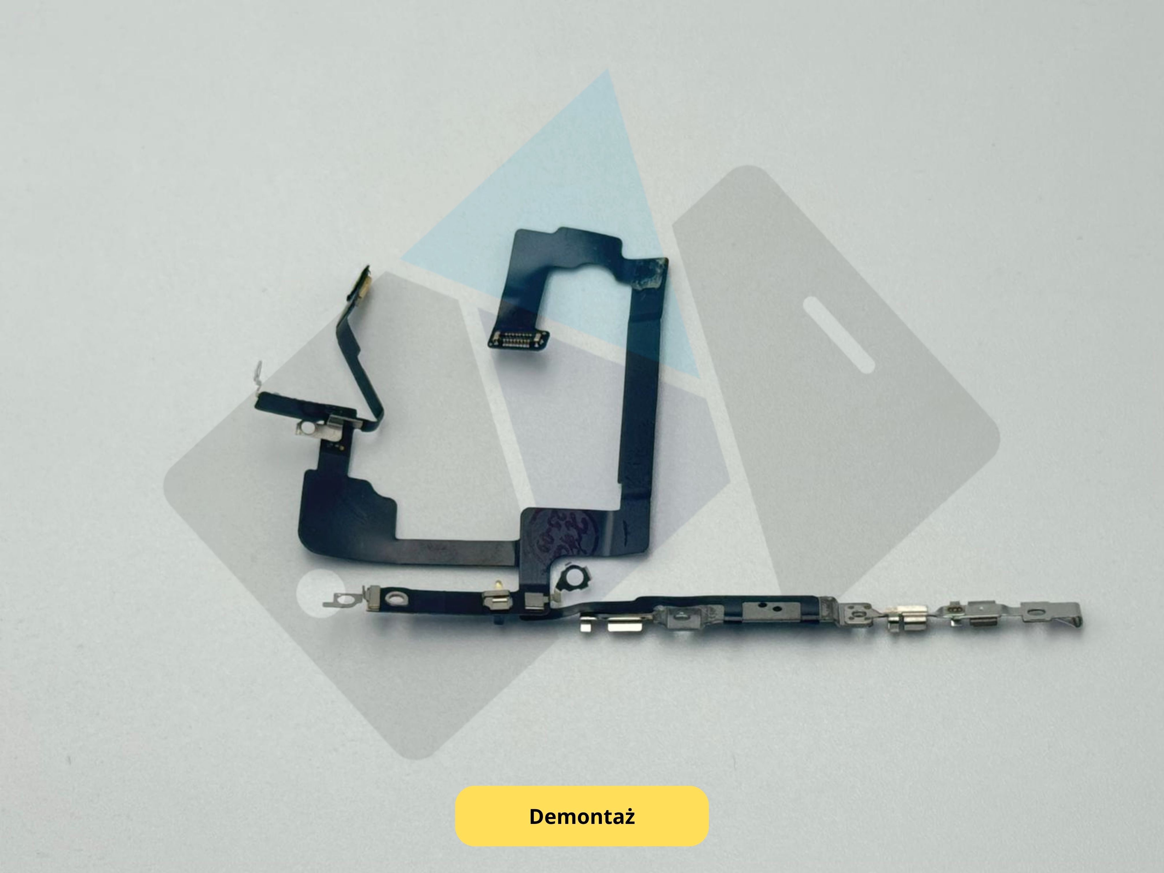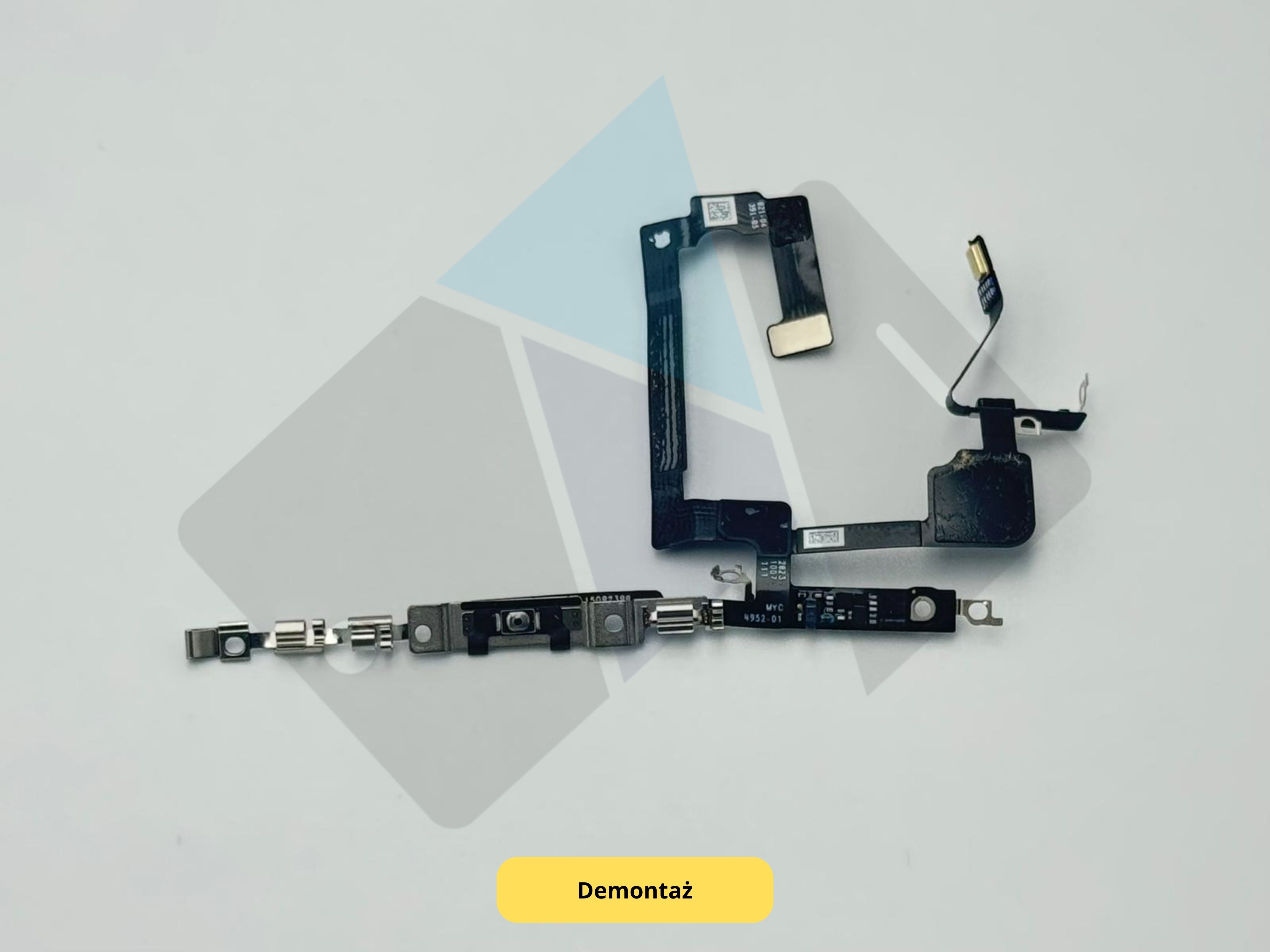 Oryginalna taśma przycisku zasilania z mikrofonem do iPhone 15, pozyskana z demontażu w pełni sprawnego urządzenia. Komponent odpowiedzialny za działanie bocznego przycisku służącego do włączania i wyłączania ekranu, restartowania urządzenia oraz aktywacji funkcji Siri.